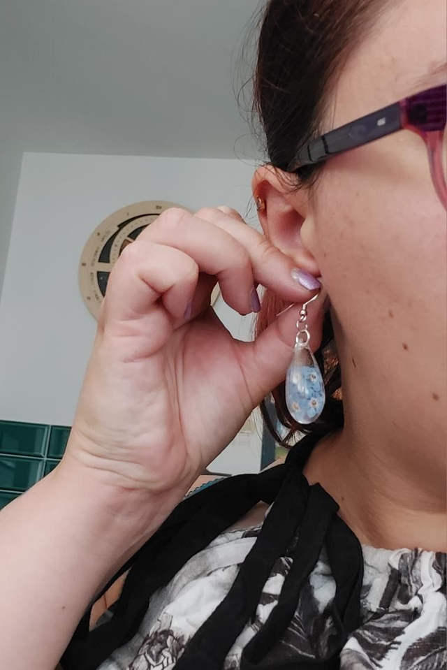 Chaque fleur est récoltée localement en Loire-Atlantique et séchée par mes soins. Les fleurs gardent leur couleur naturelle dans la résine. Chaque bijou est unique et original, vous recevez donc un bijou similaire à celui de la photo.