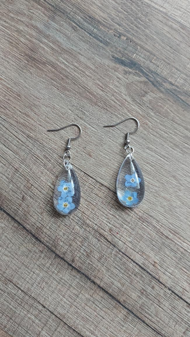 D'adorables boucles d'oreilles en forme de gouttes avec des inclusions en myosotis de mon jardin, hauteur 5cm.,