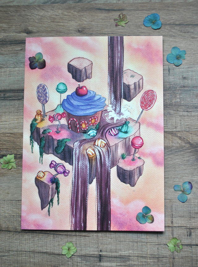 CRÉATION : J'ai réalisé cette illustration aux crayons de couleurs et aquarelle, en revisitant de façon plus moderne le conte d’Hansel et Gretel. Je collabore ensuite avec un imprimeur français labellisé Imprim’Vert, garantissant une impression de haute qualité sur un beau papier.